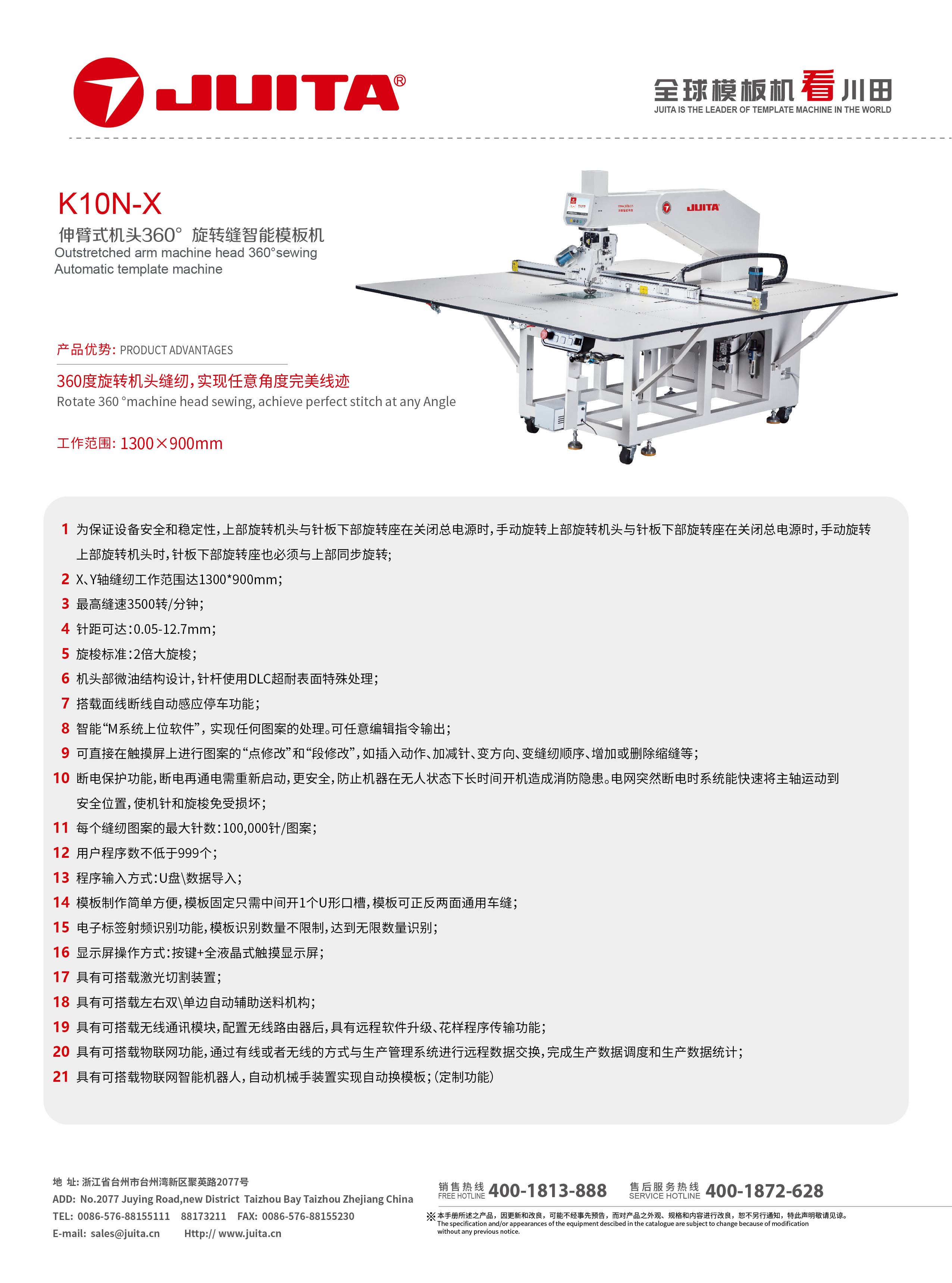 有效缝纫范围 X轴130xY轴90cm 最高缝速 200rpm-3500rpm(需要看机型、针距、材料、缝线情况) 剪线机构 圆刀剪线机构,适应性更广泛 可识别模板文件 电子标签射频识别:识别数量无限 缝针 缝针DPx5(#7-#24):DPx17 (#11-#24) 程序输入装置 电脑USB数据线或U盘 操作显示屏 全液晶:触摸式液晶显示屏 传动结构 齿带导轨模组 程序记忆载体 EPROM内存 缝纫机马达 650W直接驱动伺服马达 电源规格 220V 1000W 咨询反馈 提交信息